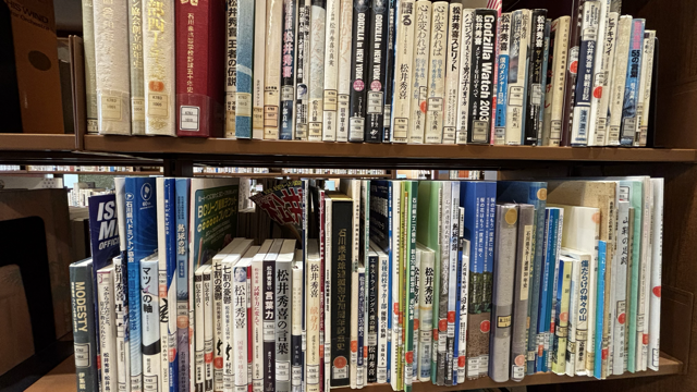 石川県の図書館らしく、2段に跨ってほぼ松井秀喜関係の書籍で埋め尽くされている棚。こういうのいいよね。(いい…)